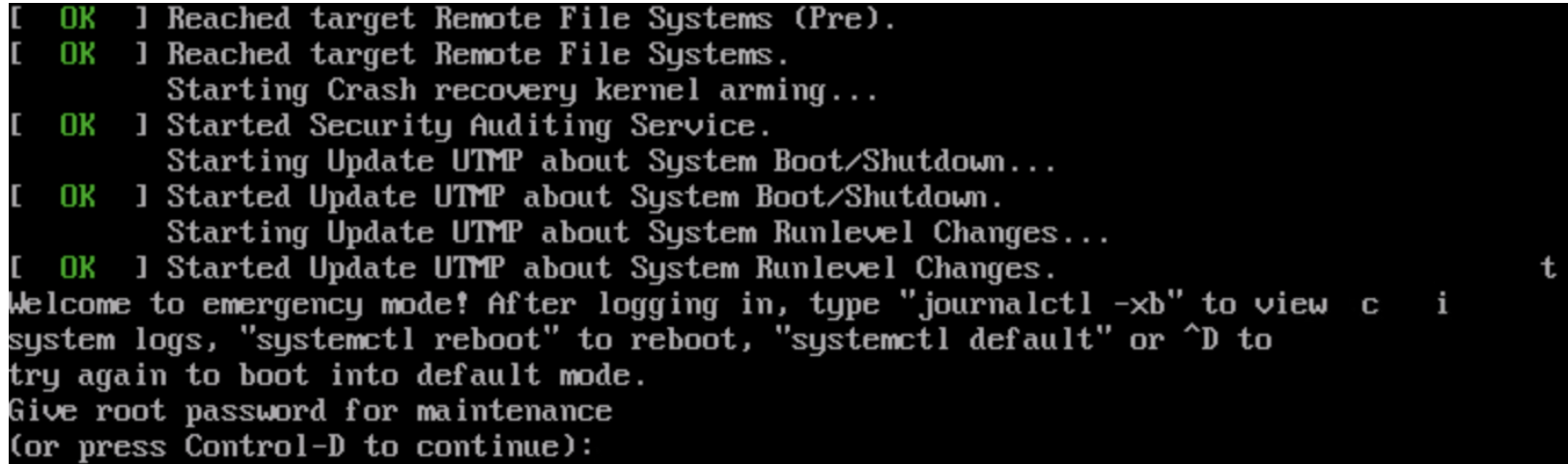 无法正常使用 SSH 远程登录 Linux 云服务器,但使用 VNC 方式登录后,查看系统启动失败且提示信息 “Welcome to emergency mode”,如下图所示: