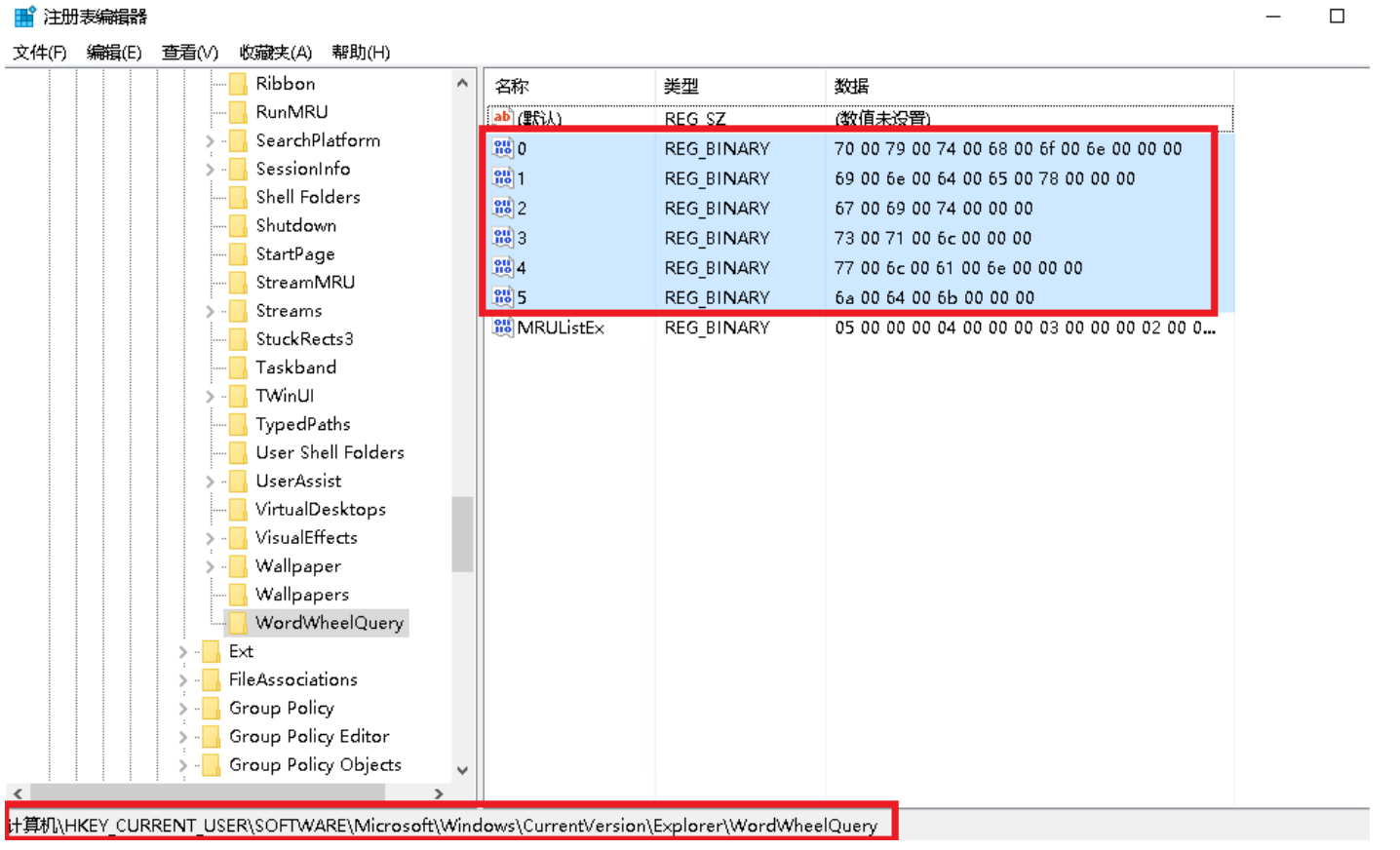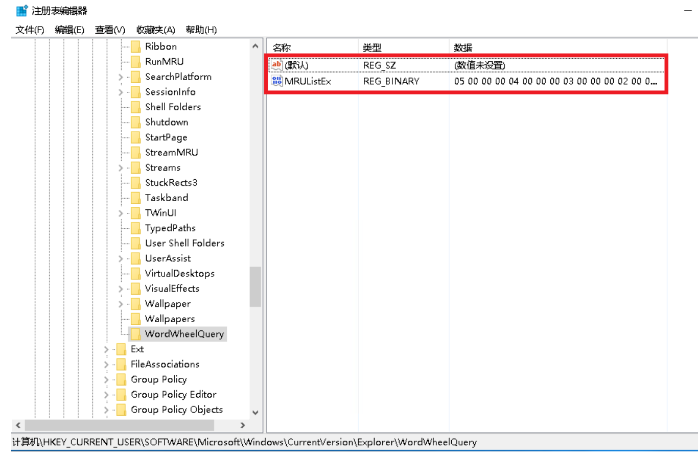 【HKEY-CURRENT-USER\Software\Microsoft\Windows\CurrentVersion\Explorer\WordWheelQuery】,删除右侧表格中除“MEUListEx”和“(默认)”之外的值