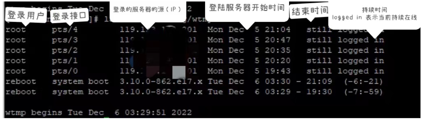 输入命令: last -f /var/log/wtmp(也可输入last查看,last默认读取的是/var/log/wtmp文件信息):
